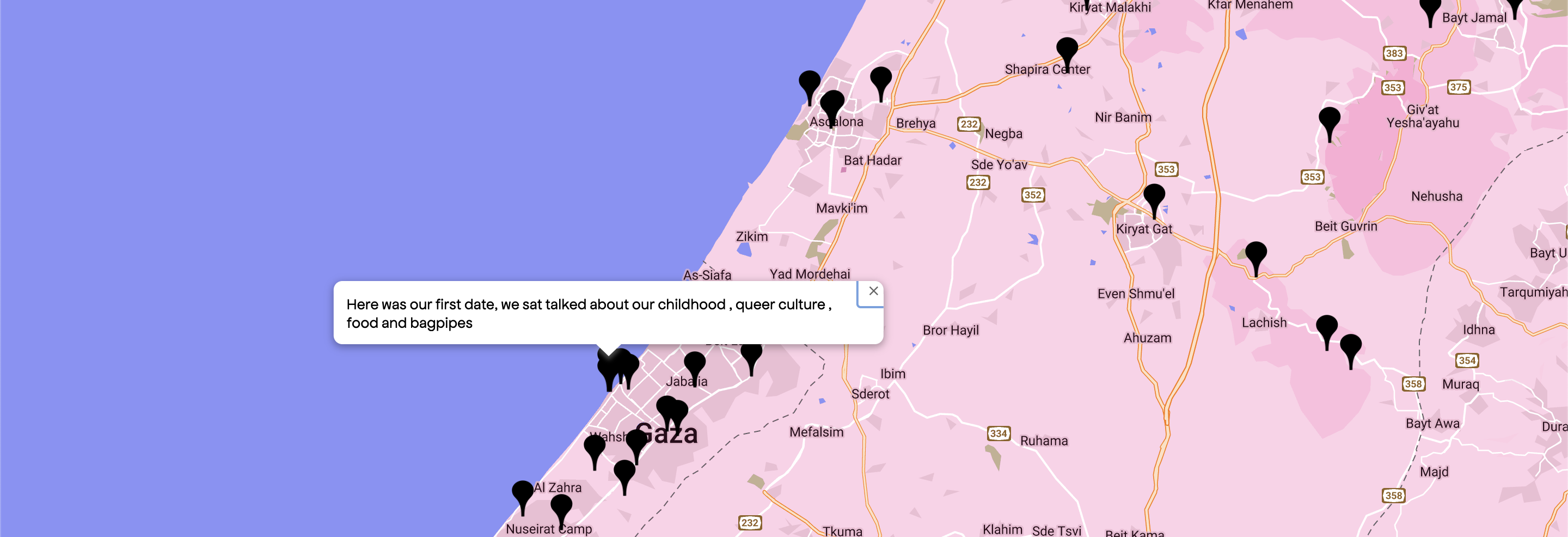 Queering the Map is a community generated counter-mapping platform for digitally archiving LGBTQ2IA+ experience in relation to physical space. The platform provides an interface to collaboratively record the cartography of queer life—from park benches to the middle of the ocean—in order to preserve queer histories and unfolding realities, which continue to be invalidated, contested, and erased. From collective action to stories of coming out, encounters with violence to moments of rapturous love, Queering the Map functions as a living archive of queer life.